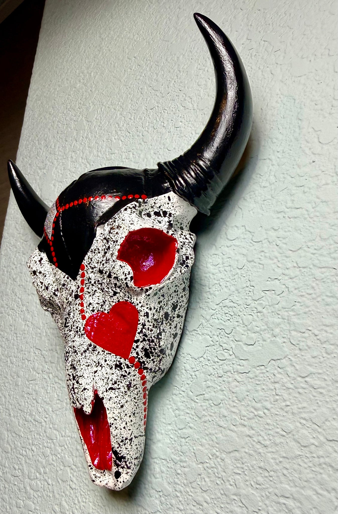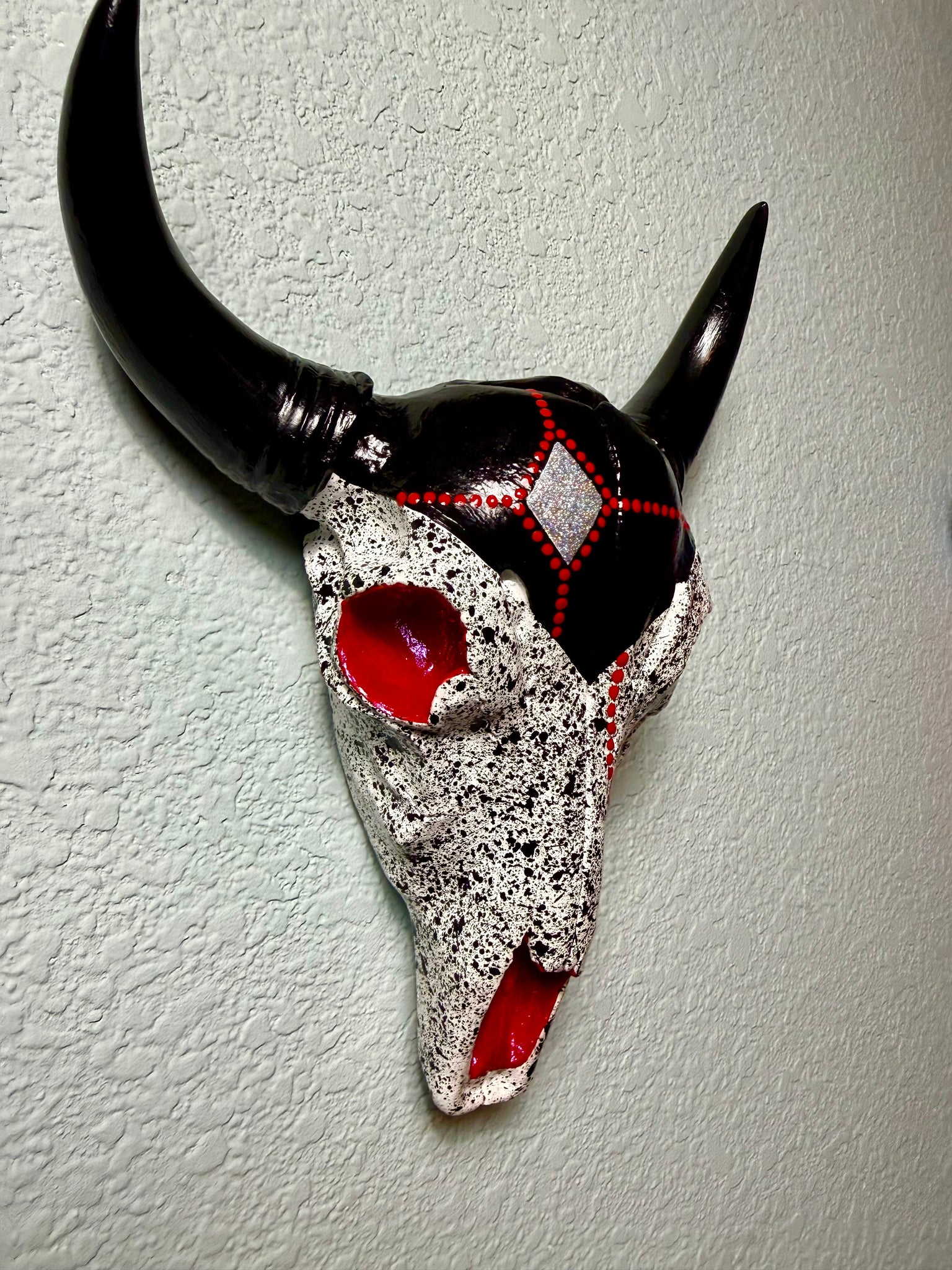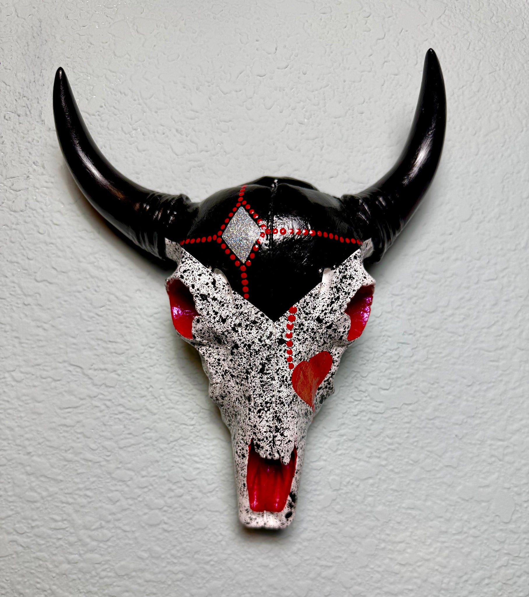 This hard resin cow skull is a one-of-one design, featuring a pearl white base with a delicate inky black splatter paint design inspired by bold simplicity of the colors and designs on a deck of cards. The interior of the eye sockets and nose cavity are a bright cherry red finished with a top coat of golden red-violet shift iridescent glaze. The entire piece is sealed with a UV protectant, high gloss glaze to protect the paint.
